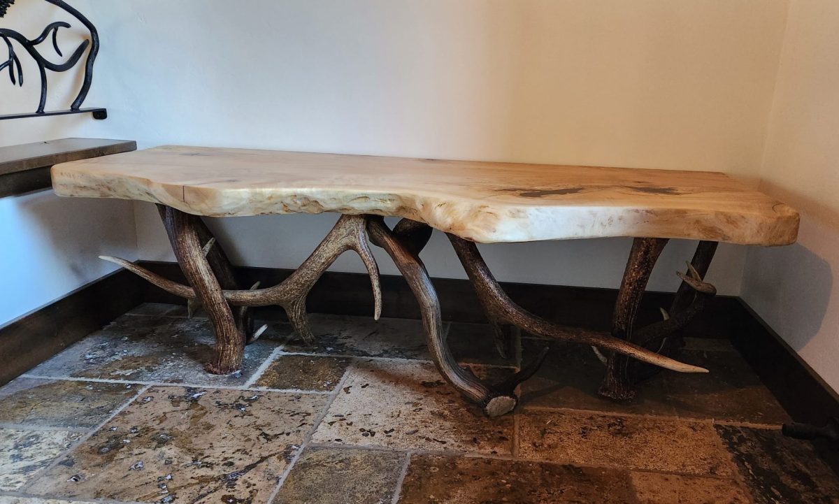 Elk and deer antler benches made with real naturally shed antlers. Seats can be upholstered with hair on hide leather, or with normal leather.