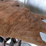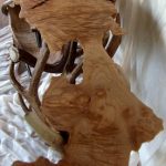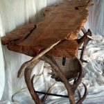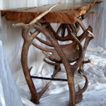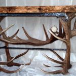 This handcrafted antler sofa table is stunning. Made from 5 naturally shed elk antlers and a moose antler it is well balanced with wood and iron elements. The moose paddle appears to just rest on the elk antler base providing a perfect spot to display your treasures, or throw your keys. We tried to preserve the integrity of each antler so some elk tines rise above the table top. The table top is made from a slab of maple burl with a live edge. The grain of the wood creates amazing illusions of depth and waves. The thickness of the wood is 2.5 inches. We’ve added some iron accents to offset the wood and antler. Below are a series of pictures of this unique table.