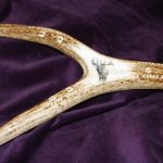Scrimshaw of bugling bull elk on elk antler piece with tracks.