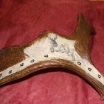 Scrimshaw of whitetail deer buck jumping over barb wire fence on moose antler paddle, with deer tracks along board.