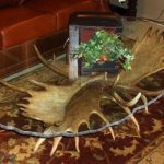This extra large coffee table is truly impressive with four to five large moose antlers; a centerpiece for your home worthy of attention. This table displays trophy size antlers with great palm width and length, as well as defined tines along the paddle. The antlers are naturally shed. Each table is different as every antler is unique.