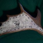 Scrimshaw of moose on a naturally shed moose antler cribbage board. Custom made for Moose Mountain Tours.