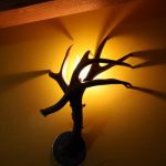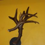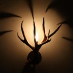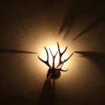 Mule deer antler wall sconce with single copper based light. Choice of either plug in light or hardwired.
