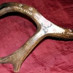 Scrimshaw of mule deer buck on shed mule deer antler cribbage board with deer tracks carved along board.