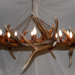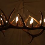 Single tier elk antler chandelier with five naturally shed elk antlers.  Two lights per antler, all light have copper aged copper sleeves.